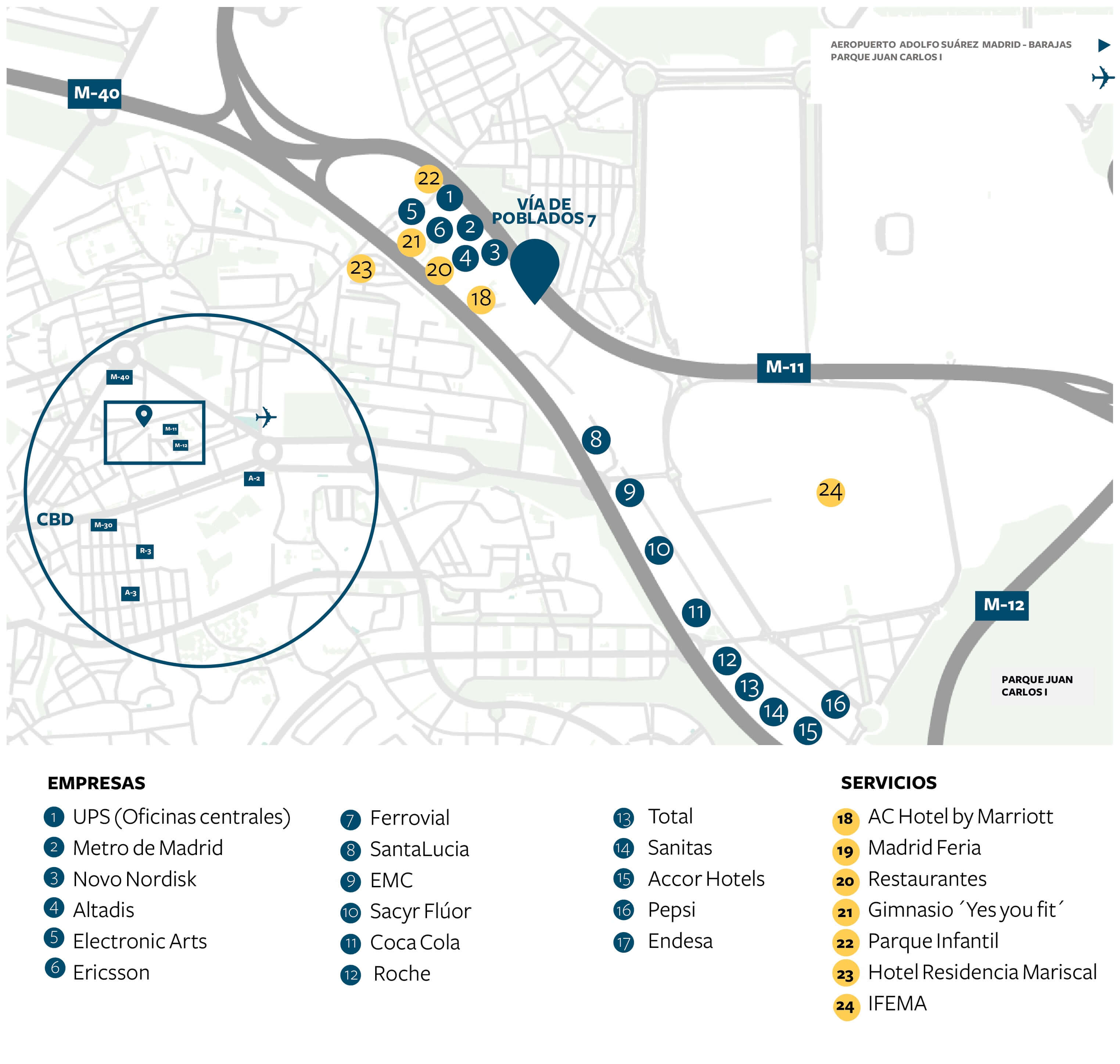 Situado en la Vía de los Poblados 7, a pie de la autopista de circunvalación M-40 y junto a la autopista M-11, que comunica la parte norte de Madrid con el aeropuerto.