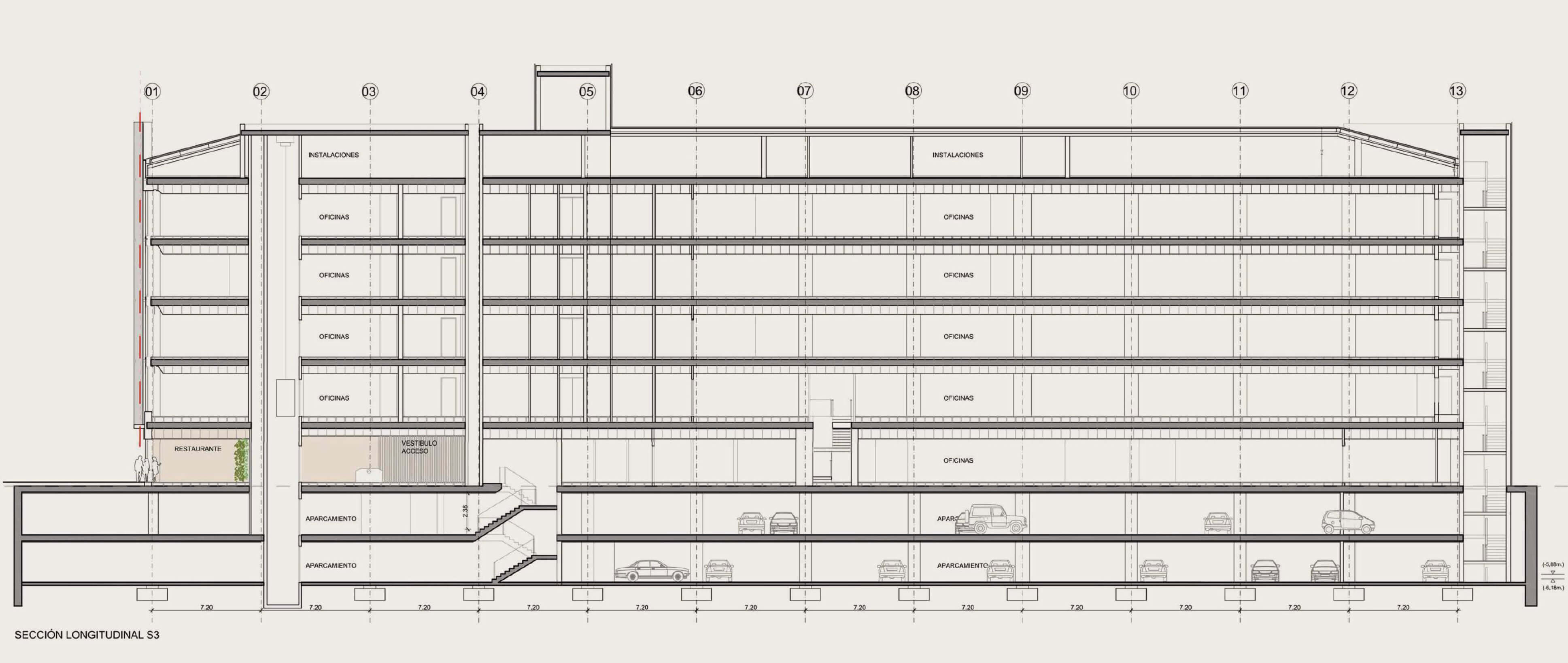El edificio se distribuye en siete plantas – cinco sobre rasante más dos de sótano destinadas a aparcamiento con una dotación de 196 plazas. Las plantas sobre rasante están destinadas a uso de oficinas que totalizan 14.500m² alquilables.